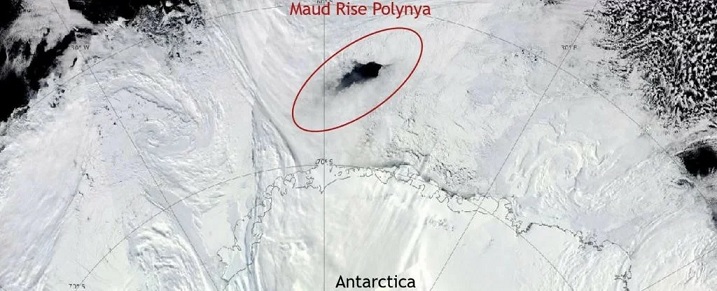 Впервые полынью, размеры которой больше Московской области, обнаружили исследователи 40 лет назад, затем она скрылась от взглядов ученых, и в 2017 году снова дала о себе знать.