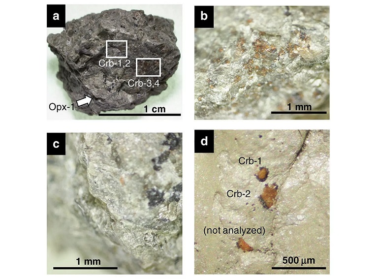 CC BY 4.0 / Koike, M., Nakada, R., Kajitani, I. et al./Nat Commun / Фрагмент метеорита ALH 84001 с разных ракурсов и в разном увеличении. Изображения b и d — увеличенные снимки зерен карбонатных минералов, в которых обнаружили азотсодержащую органику.