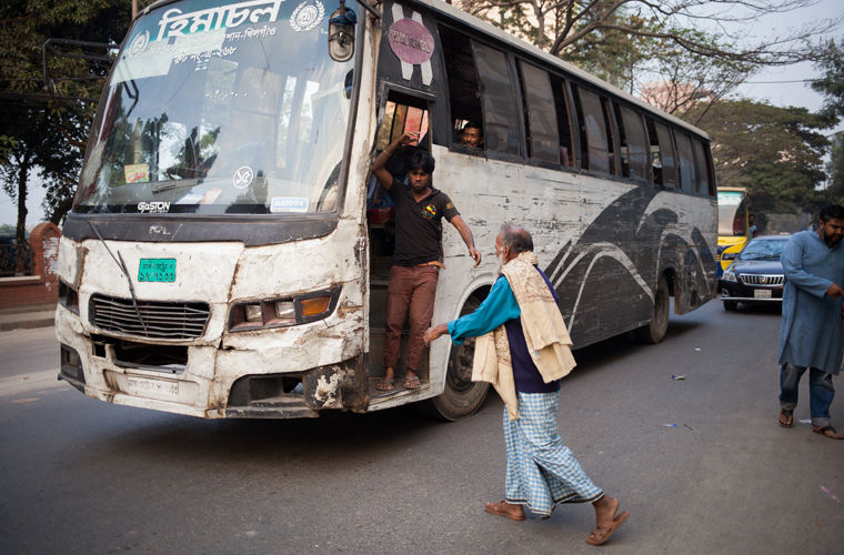 Автобусы в Бангладеш — это мастодонты, ископаемые агрегаты, которые, такое чувство, стекаются сюда со всей Азии, причем исключительно после крупных аварий. Найти хотя бы относительно целый трудно — большинство из них окрашены не менее десятка раз, так что краска отслаивается кусками, и биты не менее тысячи раз. Часто можно наблюдать битву автобусов, когда около остановки один не пропускает другой и они начинают умышленно друг друга «бодать» и подталкивать, освобождая себе место.