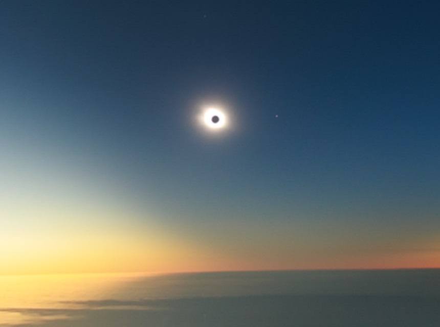 Он рассказал, что путешествовал одним из двух отдельных рейсов (второй виден на изображении у кончика крыла), параллельно парящий в воздухе в тени. Затмение продолжалось около 2 минут, яркие Меркурий и Антарес были видны вокруг солнца.
