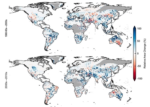 Фото из открытых источников / Покрытие озерами по всему миру в течение двух периодов времени, охватывающих 1984-2019 годы / Nature Communications, 2022)